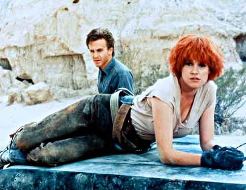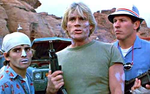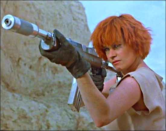 The ensuing odyssey sees this pair tangling with Lester (Thomerson), a “total wacko” who controls Zone 7, and sends Sam and E. into a drainage tunnel of the Hoover Dam. There they meet Jake (Ben Johnson), an elderly acquaintance of E. who’s unable to prevent Sam from being whisked off to Sky Ranch. There he meets the high spirited Lester and his retinue, but manages to break out with E.’s help. From there the two make their way to the location of the Cherry 2000 double, which happens to be in a sand blanketed Las Vegas.
