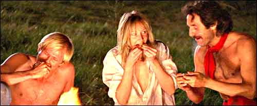 A bit later the trio, led by a stray dog (Larry), settle in a tropical landscape where the dark-haired man and the woman have sex by a roaring fire while the blonde fellow runs off. The woman takes pity on the latter and seduces him while the other watches, precipitating a sexual dynamic that grows increasingly fractured.