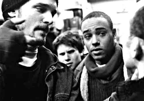 JOHNNY’s narrative drive is quite loose, powered by heavily improvised dialogue (with many randomly inserted “fucks”) and unvarnished urban locales (Dogma rule #1: “No sets or props are allowed”). In keeping with the verité air, the video camera images were shot with available light (Dogma rule #7: “Special lighting is not allowed”) by the actors; the results are intercut with the “real” footage, filmed by Bessai and cinematographer John Westheuser in constantly roving handheld fashion (Dogma rule #3: “The camera must be handheld”).