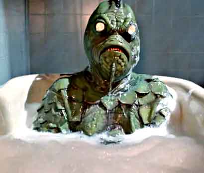 But then the book is lost, and a monster begins stalking the house. Even weirder, something cleans up the kitchen during the night and on Friday the 13th a fish critter attacks Debbie and kills a cop, and masses of bats swarm Mary in the attic, leaving her with two bite marks on her neck. John calls a local extermination outfit that dispatches Van Helsing (Severn Darden), a weirdie who claims to know what’s happening in the house and how to stop it (hint: it involves the book).