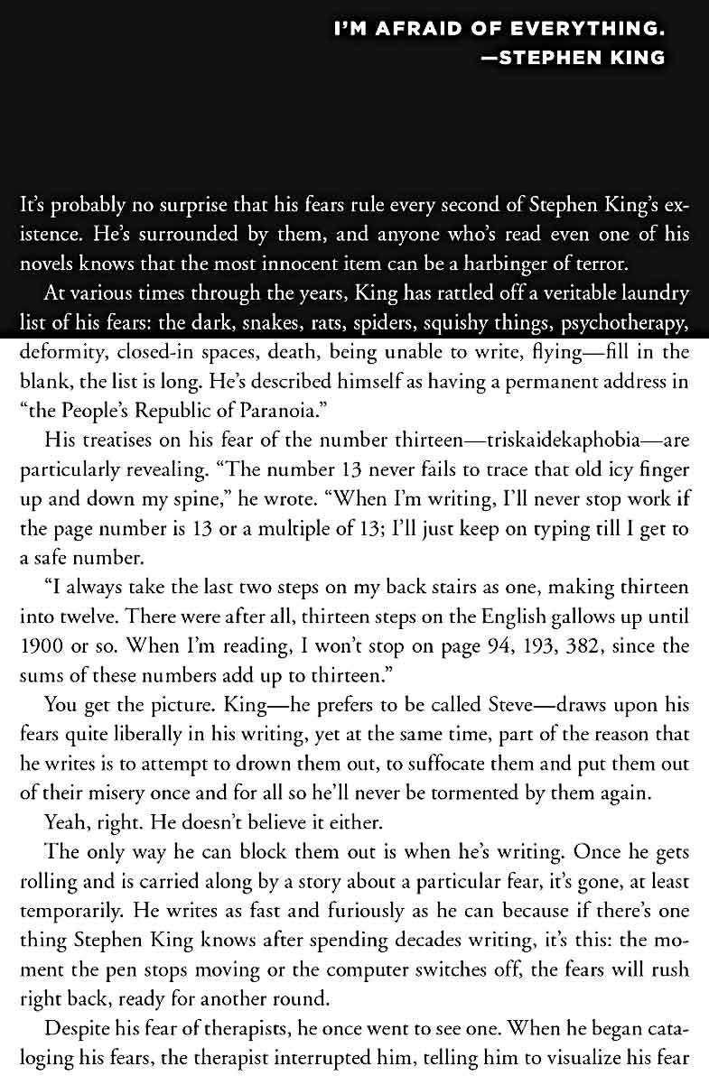 One thing Lisa Rogak makes clear in this book is that, contrary to what Stephen King is always claiming in interviews, her subject is NOT a “normal” guy. His penchant for writing horror, Rogak claims, stems from an unsettled childhood dominated by a missing father who went out for cigarettes one day when Stephen King was a young child and never returned. This led to years of poverty that left King with innumerable phobias that lingered throughout his life. He also developed an obsessive work ethic, with his claim that the only days he doesn’t write are the Fourth of July, his birthday and Christmas being a flat-out lie—he actually writes every day.